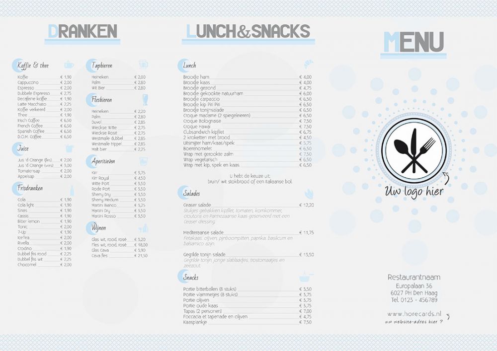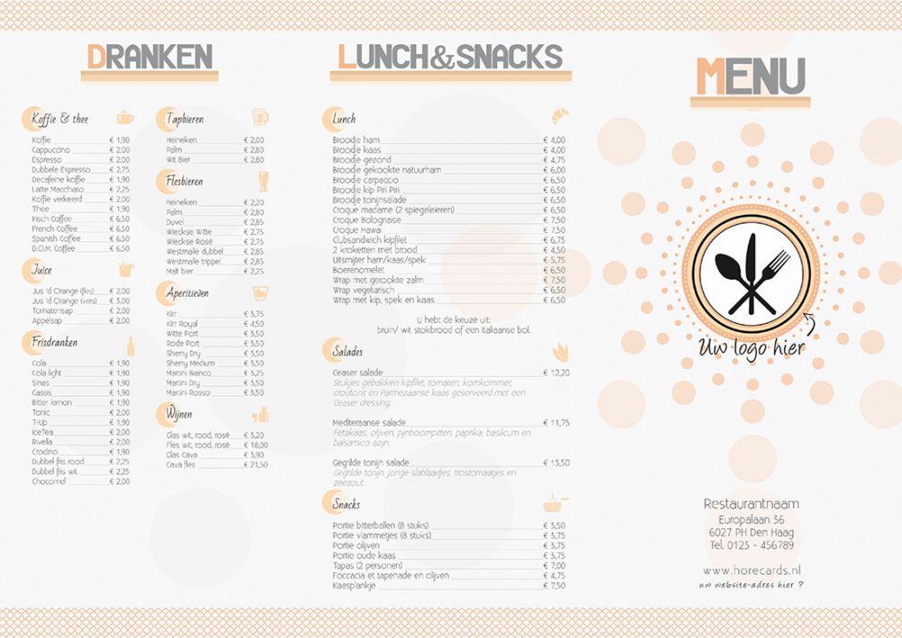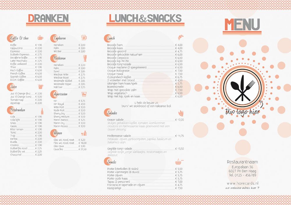 Dit menu design is speels, modern en heeft een krachtige uitstraling. Het dynamische 'bolletjes' ontwerp springt er uit. Door gebruik te maken van iconen zijn de producten gemakkelijker te vinden. Deze menukaart is geschikt voor een lunchroom, strandpaviljoen, restaurant en nog veel meer.