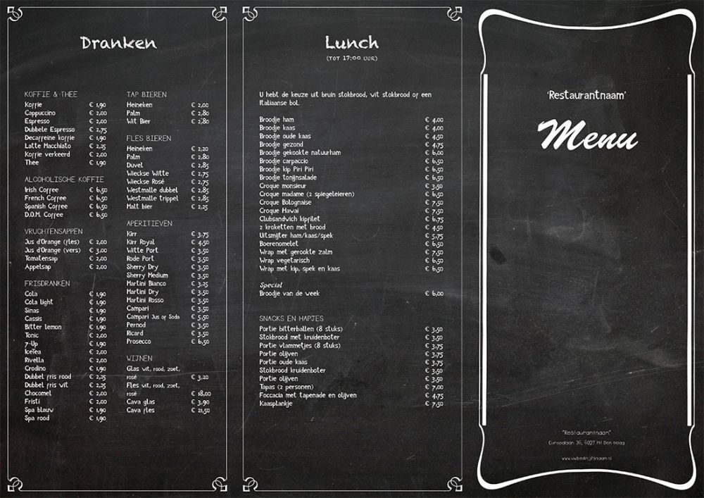 Een krijtbord wordt vaak gebruikt door restaurants om gerechten op te schrijven. Maar dit kan natuurlijk nog veel creatiever als menukaart! De tekst en lijsten hebben een textuur en stijl waardoor het lijkt alsof het op een echt krijtbord is geschreven. Deze menukaart is inzetbaar voor diverse horeca bedrijven.